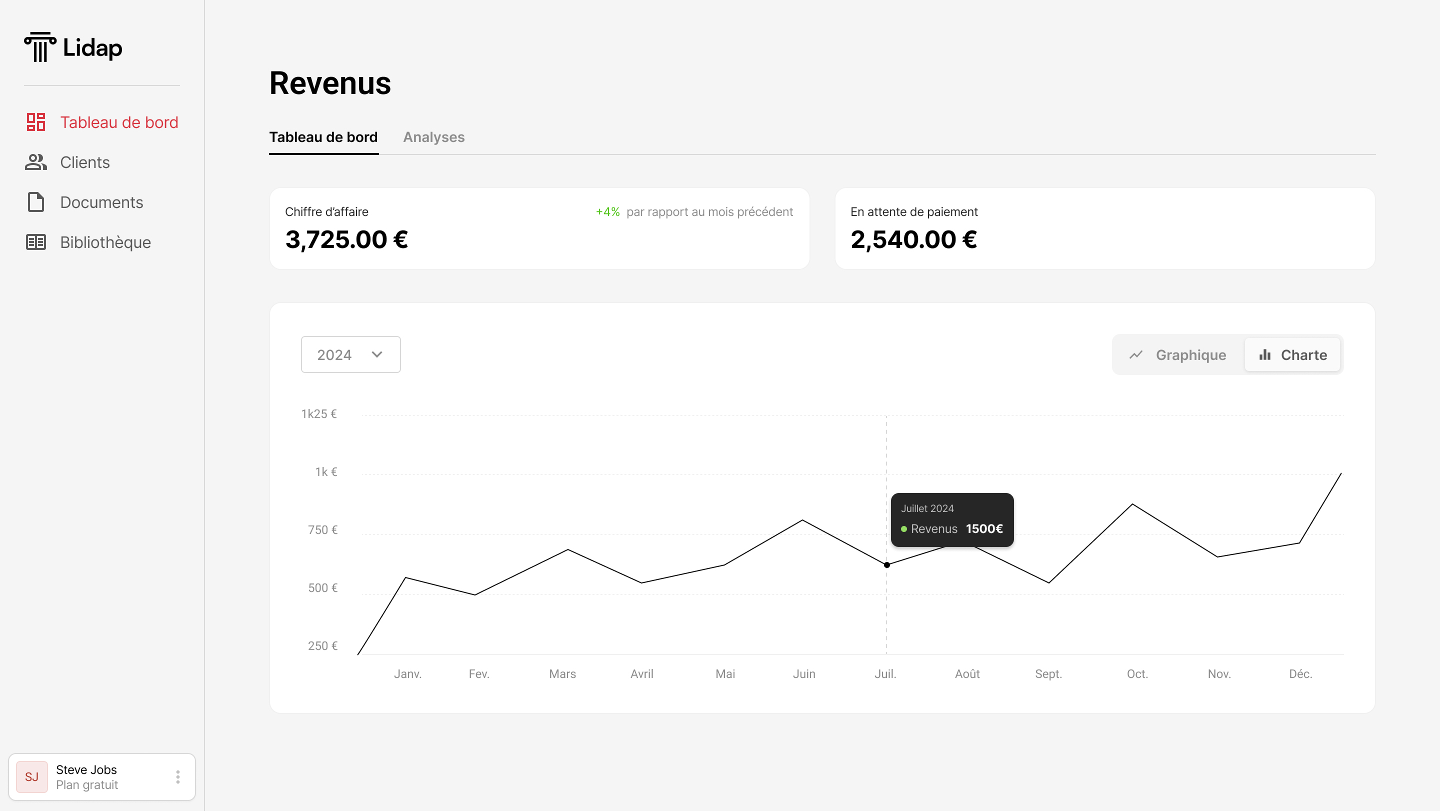Lidap vous partage un tableau de bord précis sur vos revenus encaissés et en attente de paiement.
